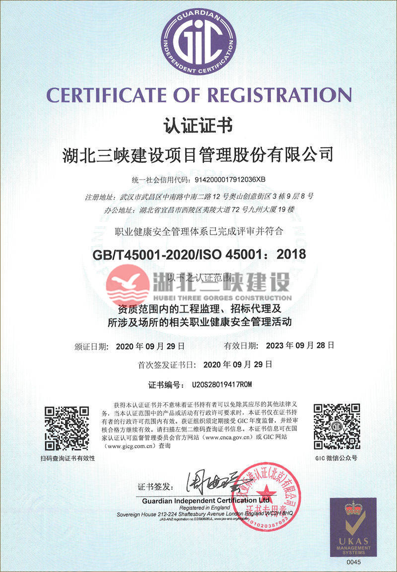职业健康安全管理体系认证证书